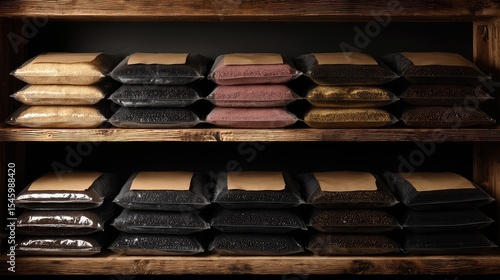 Naklejka premium Assorted sealed grain packs on tiered wood shelves with uniform product...