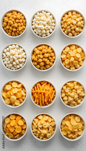 © santy, Fototapeta premium Assorted Snacks in Ceramic Bowls – Isolated on White Background