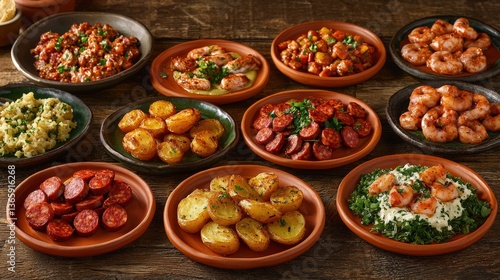 Fototapeta premium Assorted spanish tapas platter with grilled shrimp, chorizo, and vegetables on rustic wooden table