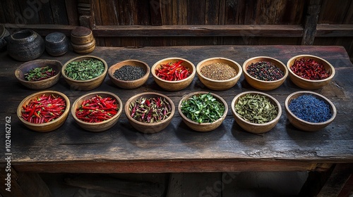 © Umar, Fototapeta premium Assorted spices and herbs in wooden bowls.