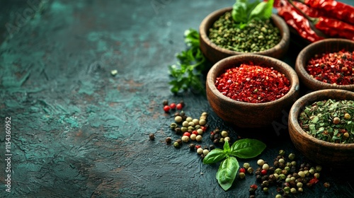 Fototapeta premium Assorted spices in bowls on a turquoise surface