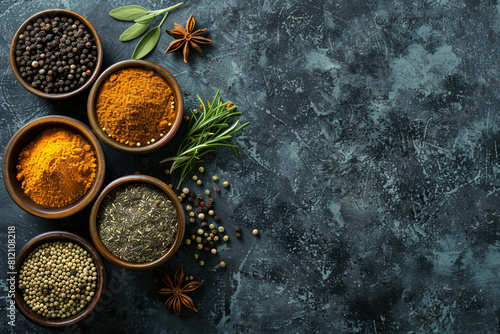 Fototapeta premium Assorted Spices in Bowls on Dark Textured Background