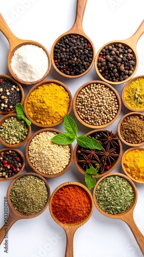 © aldi, Fototapeta premium Assorted spices in small wooden bowls