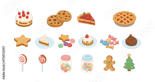 Fototapeta premium Assorted sweets: cakes, cookies, pies, candies, gingerbread in flat style