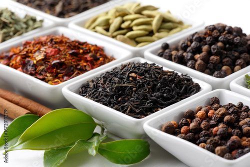 Fototapeta premium Assorted teas and spices in small white bowls with cinnamon sticks and leaves