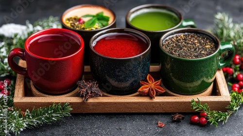 © tugkiara, Fototapeta premium Assorted Teas on Wooden Tray, Festive Setting