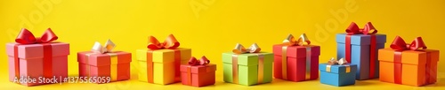 Obraz premium Assorted vibrant gift boxes on yellow backdrop for special occasions,...