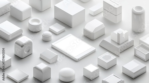 © Andi, Obraz premium Assorted white geometric shapes arranged on a light background.