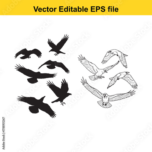 Naklejka premium Assortment of black silhouette flying birds and detailed line art birds in flight