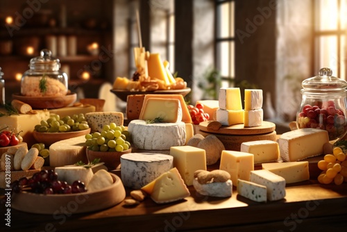© vachom, Fototapeta premium Assortment of cheese on wooden table, closeup. Dairy products. Cheese Selection. Large assortment of international cheese specialities.