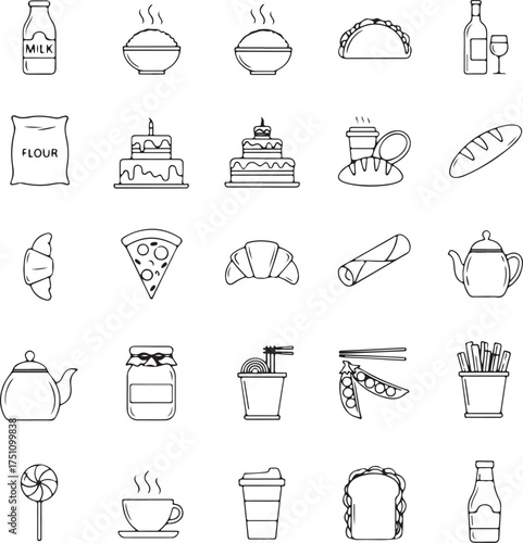© shiuli, Naklejka premium Assortment of Food and Drink Icons in Outline Style milk bottle rice bowl