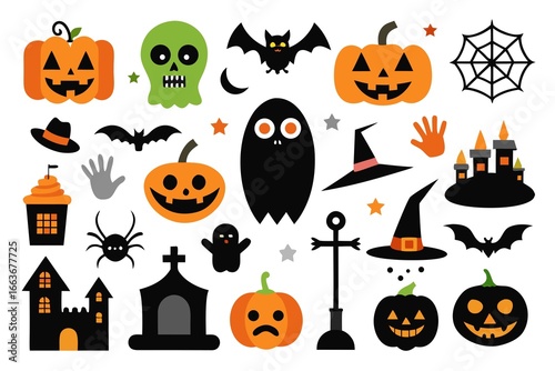 Fototapeta premium Assortment of halloween elements like pumpkins, ghosts, bats, skulls, witches hats, haunted houses, and spiders, isolated on white background