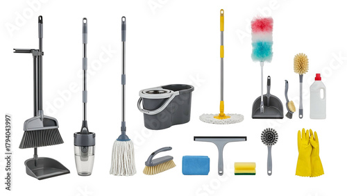 Naklejka premium Assortment of household cleaning implements and supplies displayed against a...