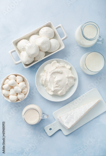 Fototapeta premium Assortment of milk products - buttermilk, kefir, yogurt with probiotics, ayran, cheese, mozzarella, quark and cream.