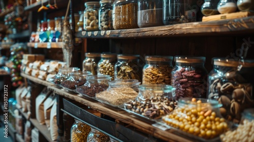 © Juan, Fototapeta premium Assortment of nuts and dried fruits in a rustic market