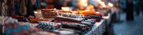 © Lila Patel, Fototapeta premium Assortment of Patterned Textiles and Jewelry at an Outdoor Market Stall
