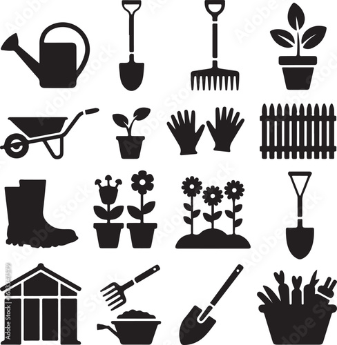 © vector design, Fototapeta premium Assortment of sixteen black and white gardening tools and plants icons watering can shovel