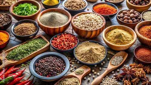 Fototapeta premium Assortment of spices and herbs in wooden bowls
