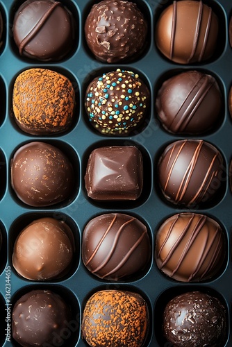 © lembar, Fototapeta premium Assortment of various chocolate truffles arranged inside a dark blue tray