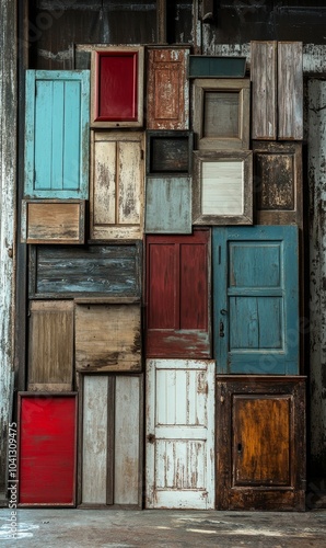 Naklejka premium Assortment of weathered wooden doors and frames.