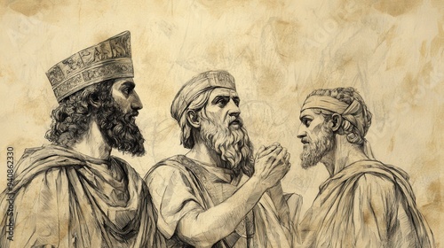 © T Studio, Fototapeta premium Assyrian Threat and Deliverance: Bible Wall Art Depicting Hezekiah’s Concern and Consultation with Advisors, Biblical Illustration on Beige Background