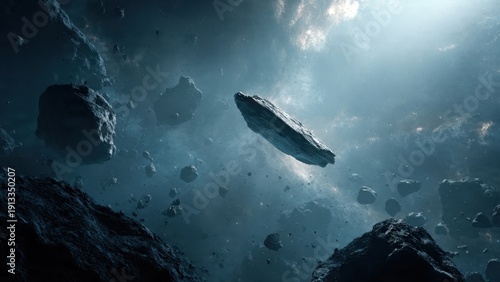 © hkjdesign, Fototapeta premium Asteroid field in deep space with light rays