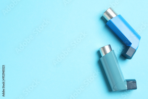 Naklejka premium Asthma inhalers on light blue background, flat lay. Space for text