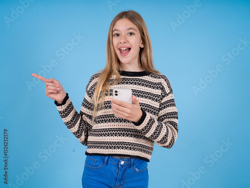 © Jihan, Obraz premium Astonished beautiful caucasian girl wearing striped sweater holding her telephone and pointing with finger aside at empty copy space