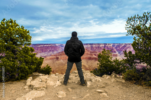 © Joana, Fototapeta premium Astonished man in the Grand Canyon, looking the view