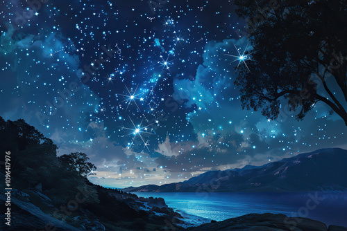 © Olegarx525, Naklejka premium Astrological composition with empty starry sky for zodiac sign symbol