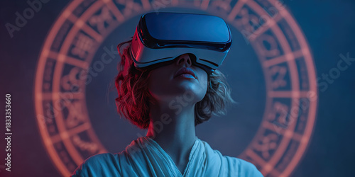 Obraz premium Astrology Forecast with Modern Technology: Person Using VR Headset to View 3D Zodiac Wheel in Neon Lights, Futuristic Horoscope Concept with Copy Space