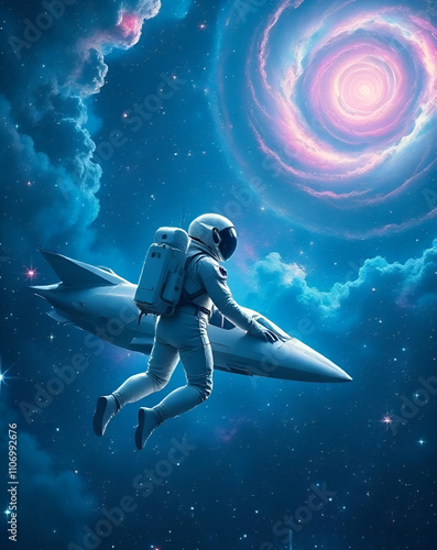 © Yuan, Fototapeta premium Astronaut and spaceship surrounded by andromeda, galaxy and stars