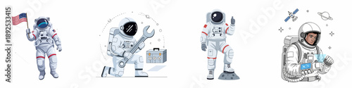 © Reno, Fototapeta premium Astronaut characters vector set depicting space missions, repair work, thumbs up for success, and technology use, isolated on a white background.
