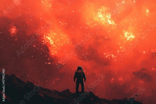 © RizArt, Fototapeta premium Astronaut Contemplates a Crimson Cosmic Landscape