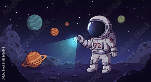 Obraz premium Astronaut Exploring Alien Planet Landscape with Flashlight and Distant Planets