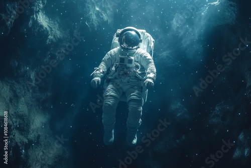 © bramthestocker, Fototapeta premium astronaut floating alone in a vast, dark universe, surrounded by twinkling stars
