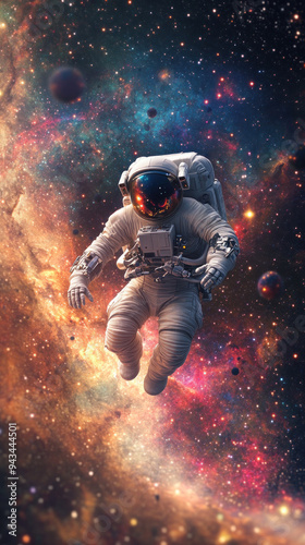 Fototapeta premium Astronaut floating amidst colorful cosmic galaxy scenery.