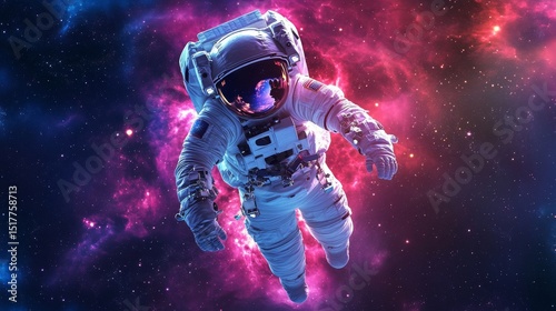 Fototapeta premium Astronaut floating in neon-lit space. Futuristic 3D scene filled with glowing...