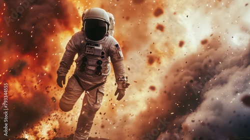 © Ibad, Fototapeta premium Astronaut floating in space in front of exploding sun. 3D rendering