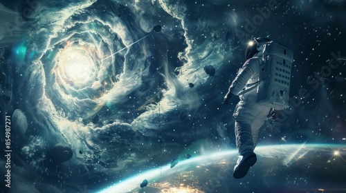 Fototapeta premium astronaut floating in space or falling into a black or worm hole on his back