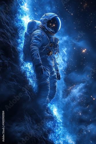 © ANISUL, Fototapeta premium Astronaut floating in space surrounded by blue energy and stars.