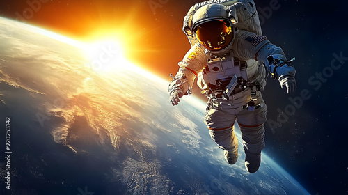 Fototapeta premium Astronaut floating in space with Earth and sunrise in the background.