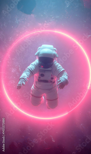 Fototapeta premium Astronaut floating within a luminous pink ring, surrounded by an ethereal...