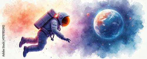 © Pete, Fototapeta premium Astronaut floats in cosmic space near Earth. Colorful nebula clouds and stars surround the figure. The illustration shows exploration and wonder of the universe.