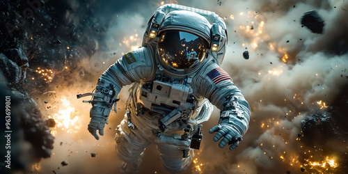 Fototapeta premium Astronaut floats in space surrounded by debris and fire.