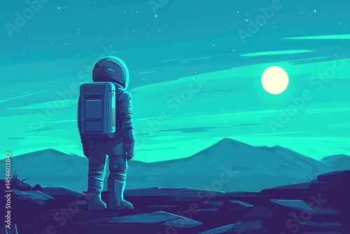 © Panithi, Obraz premium Astronaut gazing at a luminous moon over distant alien landscape