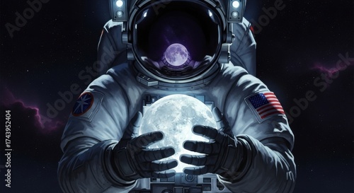 © Moslema, Fototapeta premium Astronaut holding a luminous moon in deep space