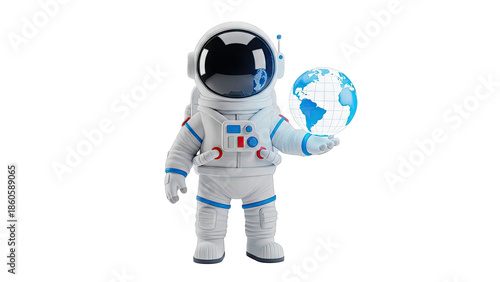 © andi, Fototapeta premium Astronaut Holding Earth Globe on White Background