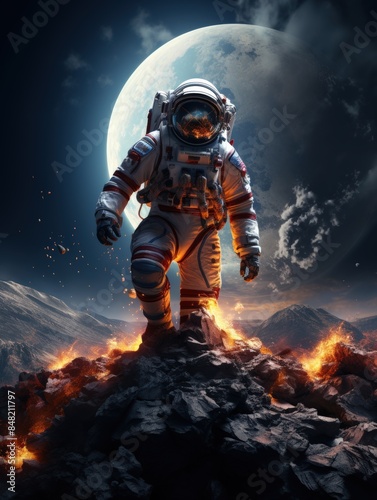 Fototapeta premium Astronaut in a fiery lunar landscape with the moon in the background, symbolizing exploration and adventure in space.