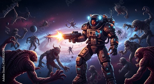 Fototapeta premium Astronaut in a pixelated mech suit fighting off space creatures in a distant...